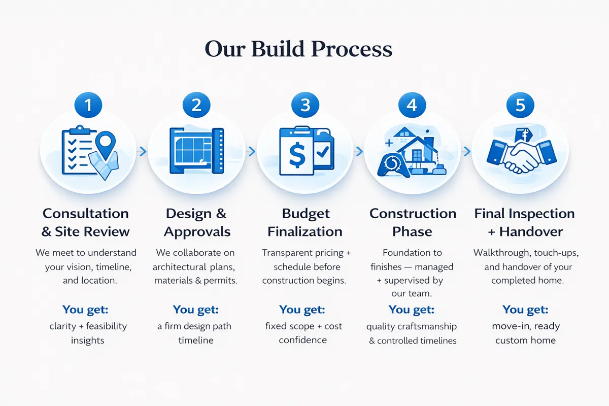 Most custom homes take 10–16 months from approved plans to completion, depending on size, complexity, permitting timelines, and weather conditions.